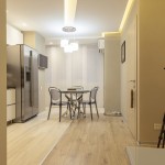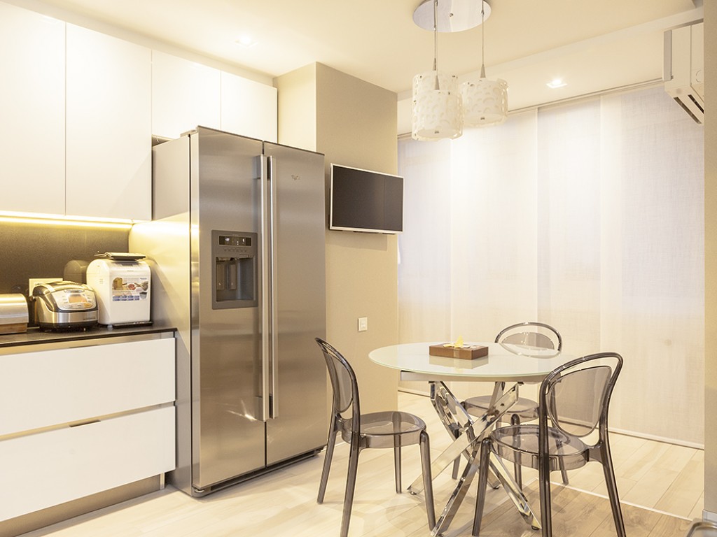 Общая площадь квартиры 80 кв.м. В квартире есть кухня гостиная, спальня, детская, 2 санузла, гардеробная.