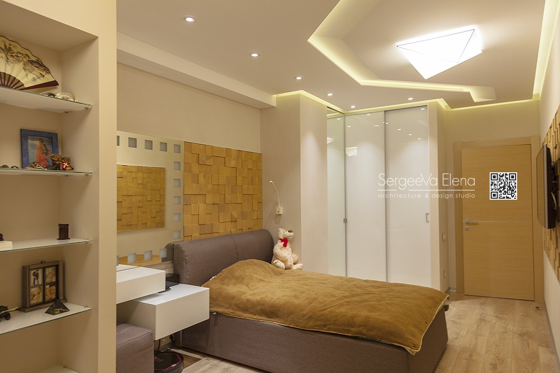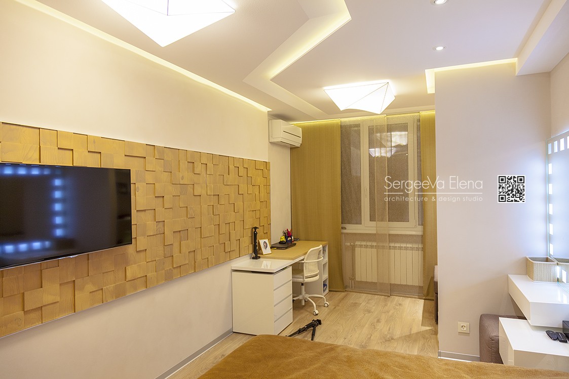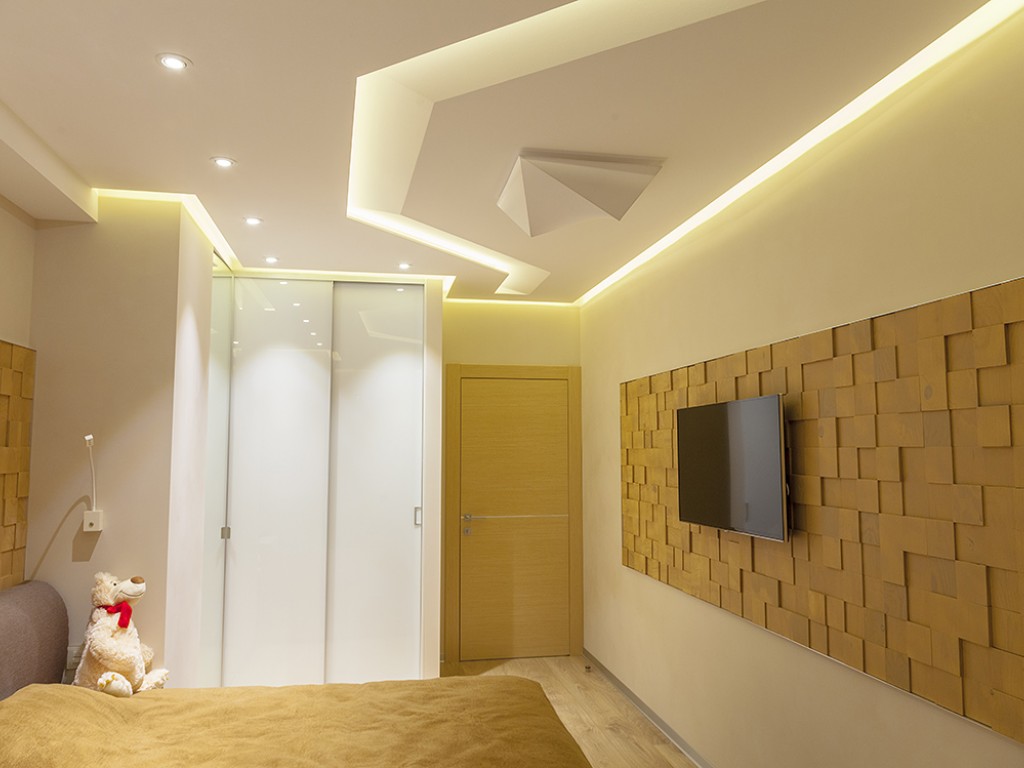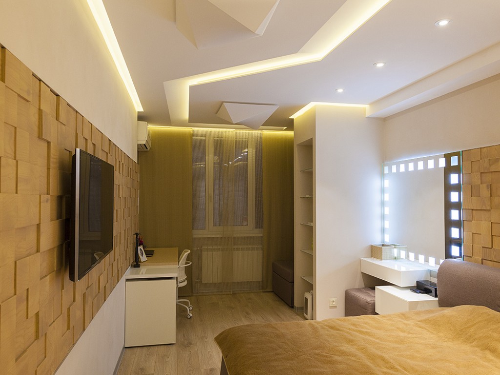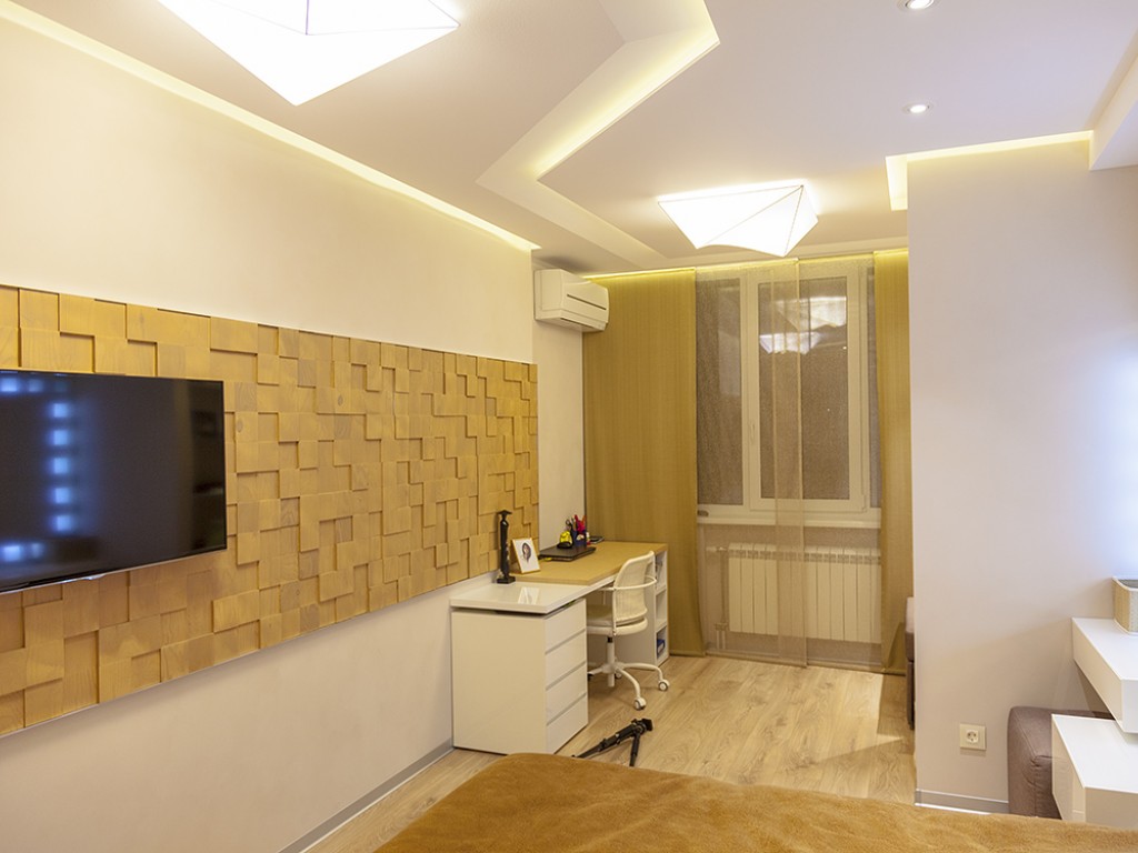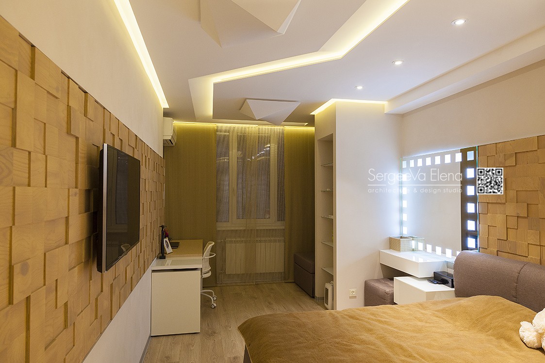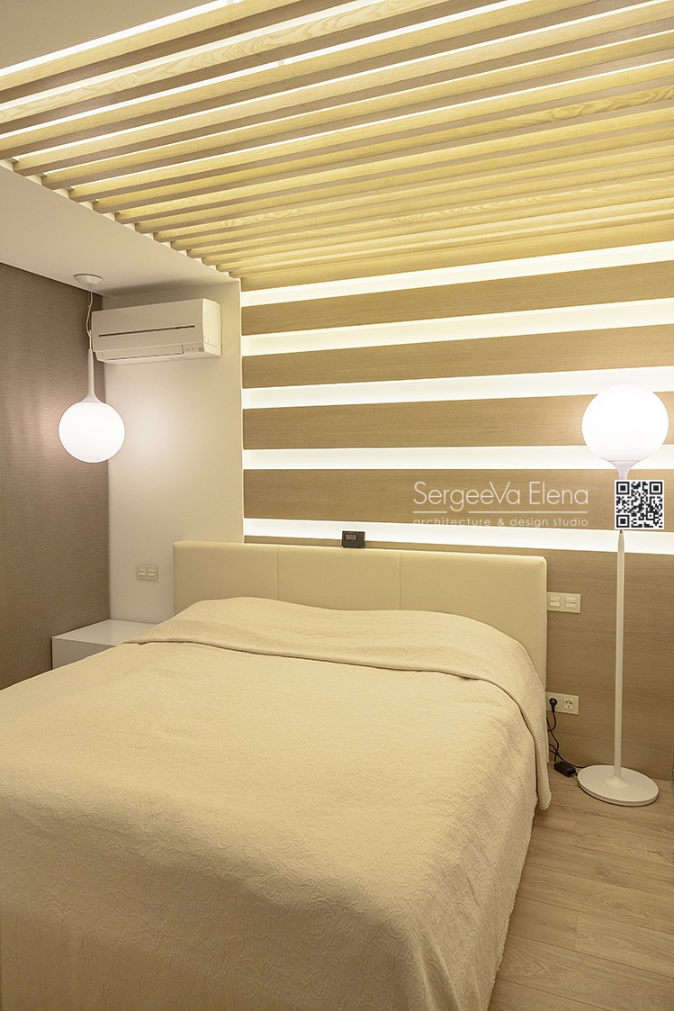 Кухня компании "Giulia Novars", деревянный декор за изголовьем кровати и на потолке от компании "Лествиль" , встроенные светильники от компании "Centrsvet"