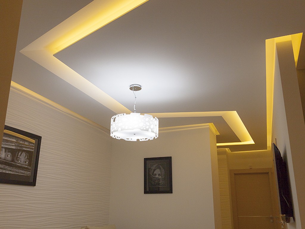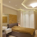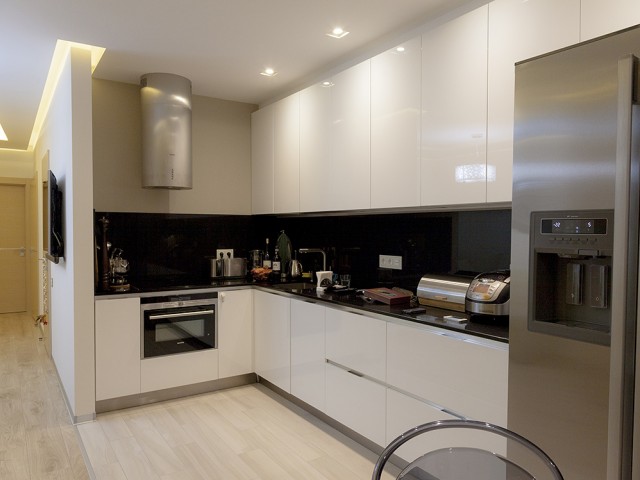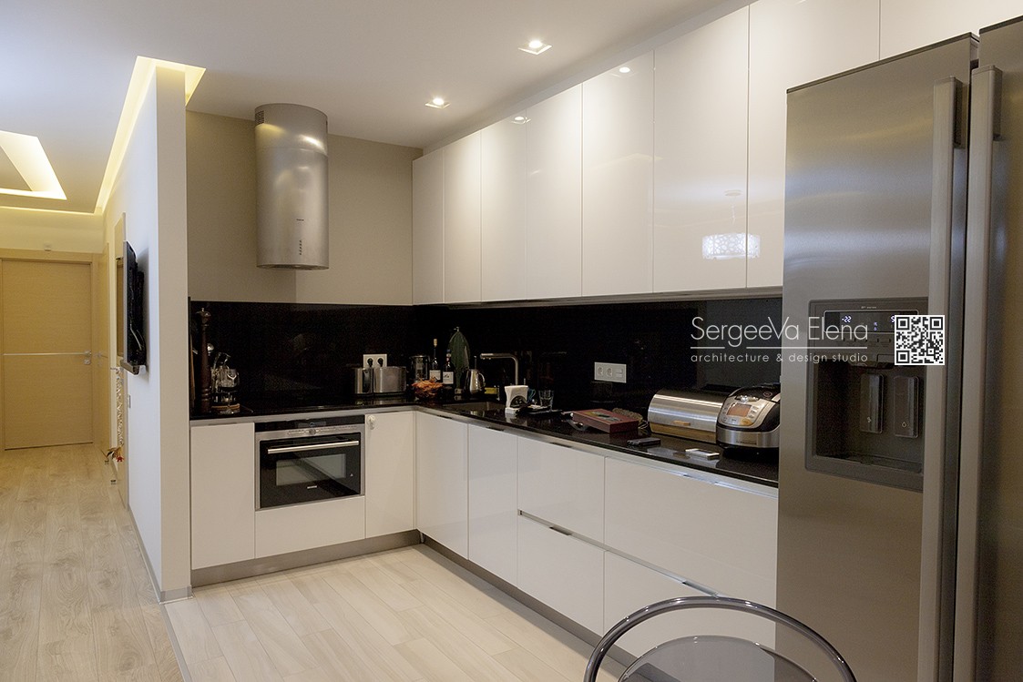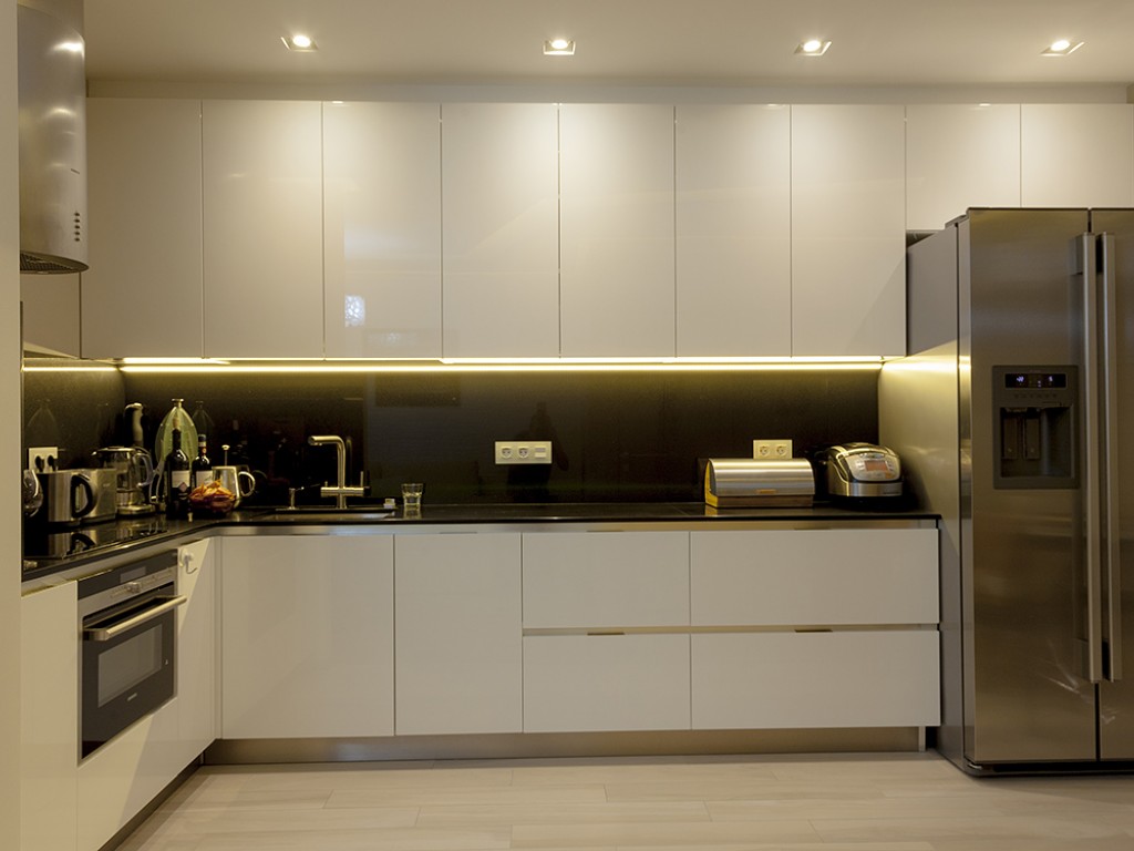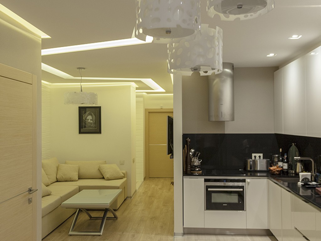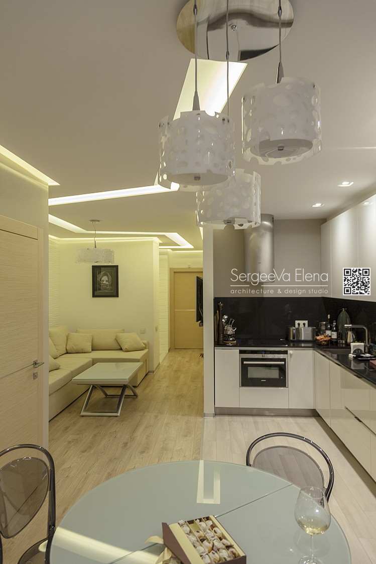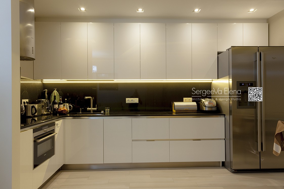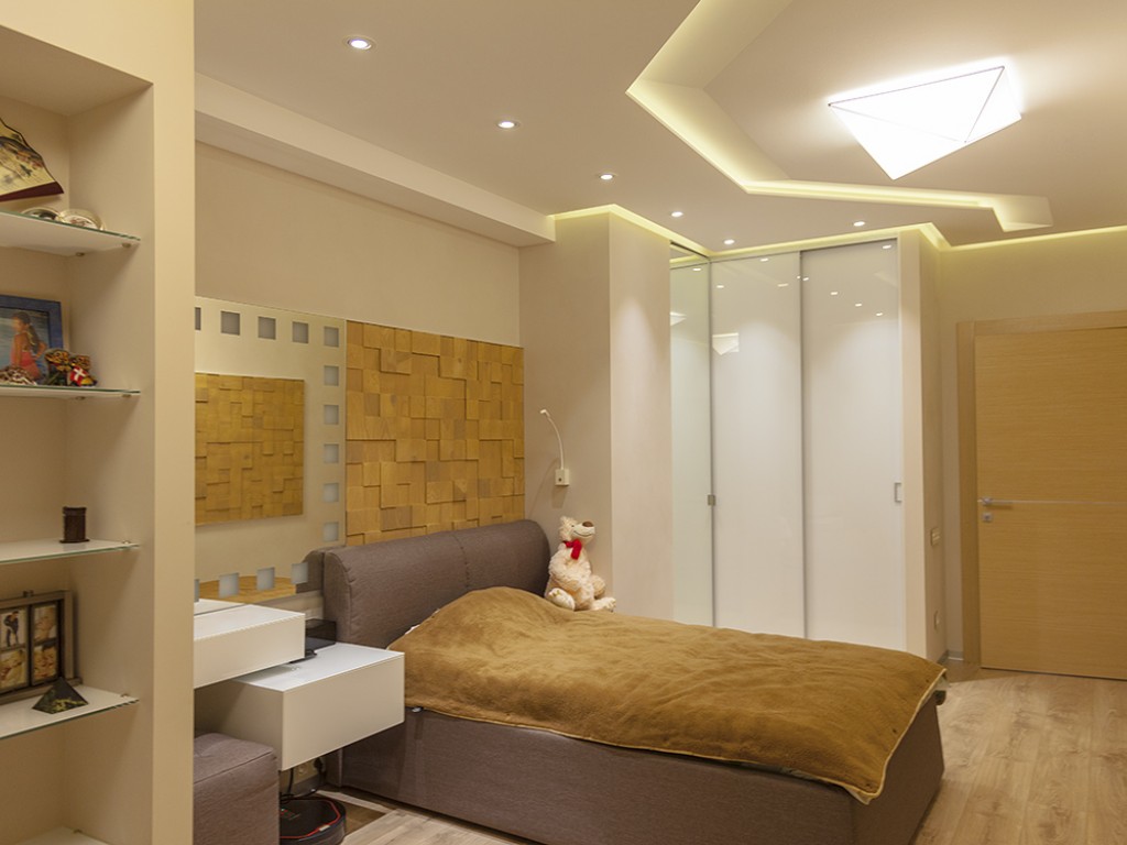 Кухня компании "Giulia Novars", деревянный декор за изголовьем кровати и на потолке от компании "Лествиль" , встроенные светильники от компании "Centrsvet"